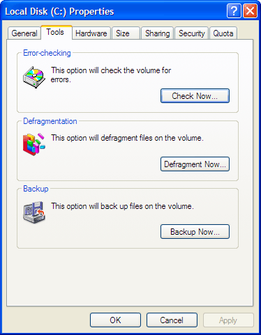 Detect and repair disk errorsIn addition to running Disk Cleanup and Disk Defragmenter to optimize the performance of your computer, you can check the integrity of the files stored on your hard disk by running the Error Checking utility. As you use your hard drive, it can develop bad sectors. Bad sectors slow down hard disk performance and sometimes make data writing (such as file saving) difficult, or even impossible. The Error Checking utility scans the hard drive for bad sectors, and scans for file system errors to see whether certain files or folders are misplaced. If you use your computer daily, you should run this utility once a week to help prevent data loss. To run the Error Checking utility: 1. Close all open files. 2. Click 3. In the My Computer window, right-click the hard disk you want to search for bad sectors, and then click Properties. 4. In the Properties dialog box, click the Tools tab.
