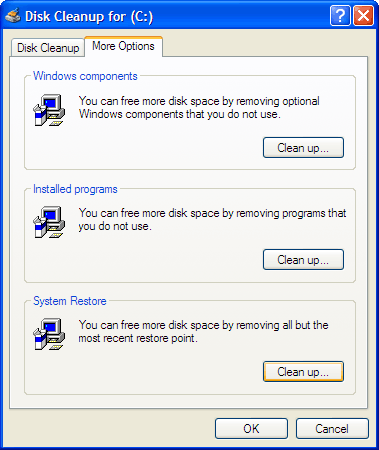 Choose the files that you want to delete. 3. Clear the check boxes for files that you don't want to delete. 4. Click on "More Options" tab for cleanup options to free more disk space, especially the "System Restore" cleanup.